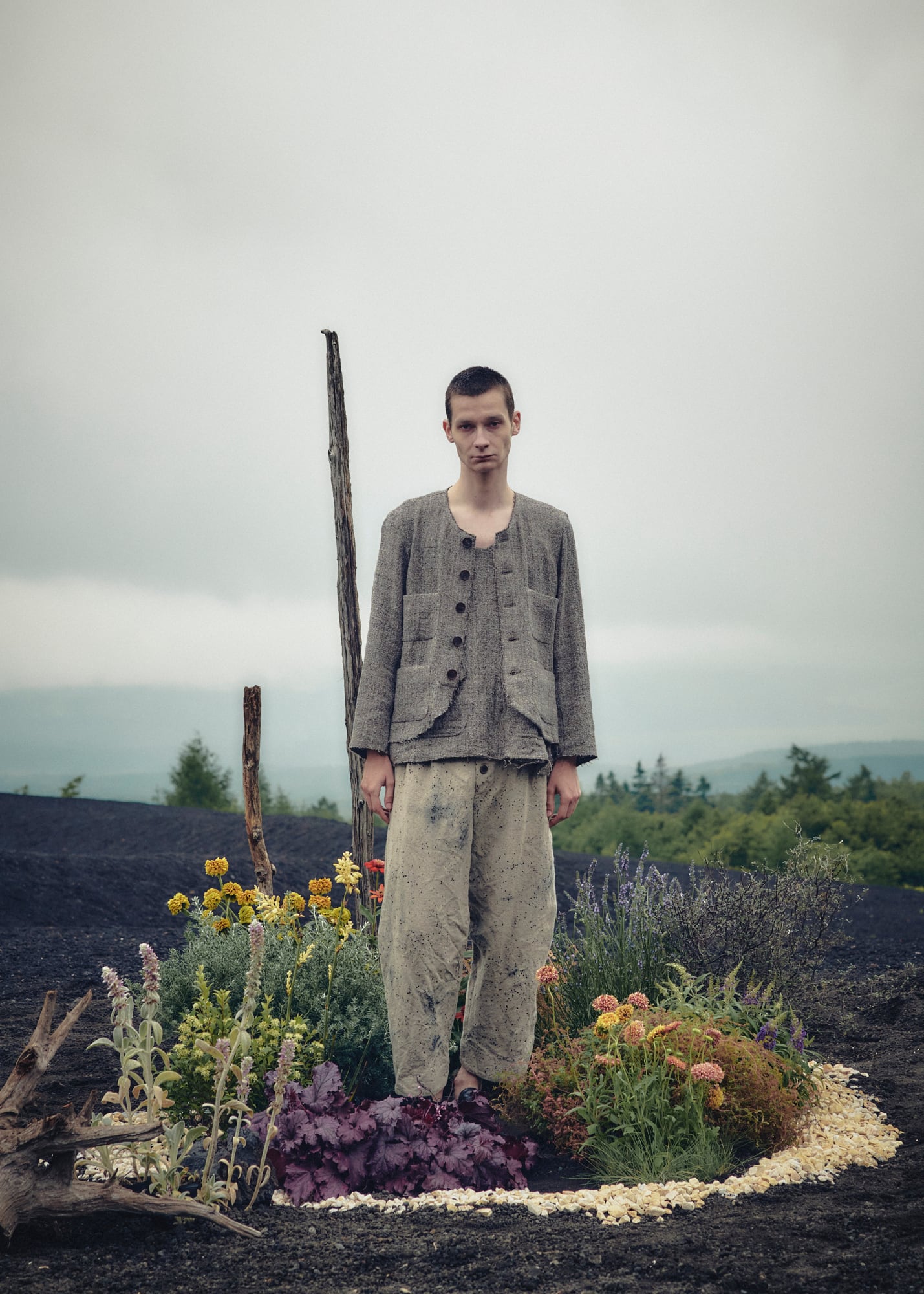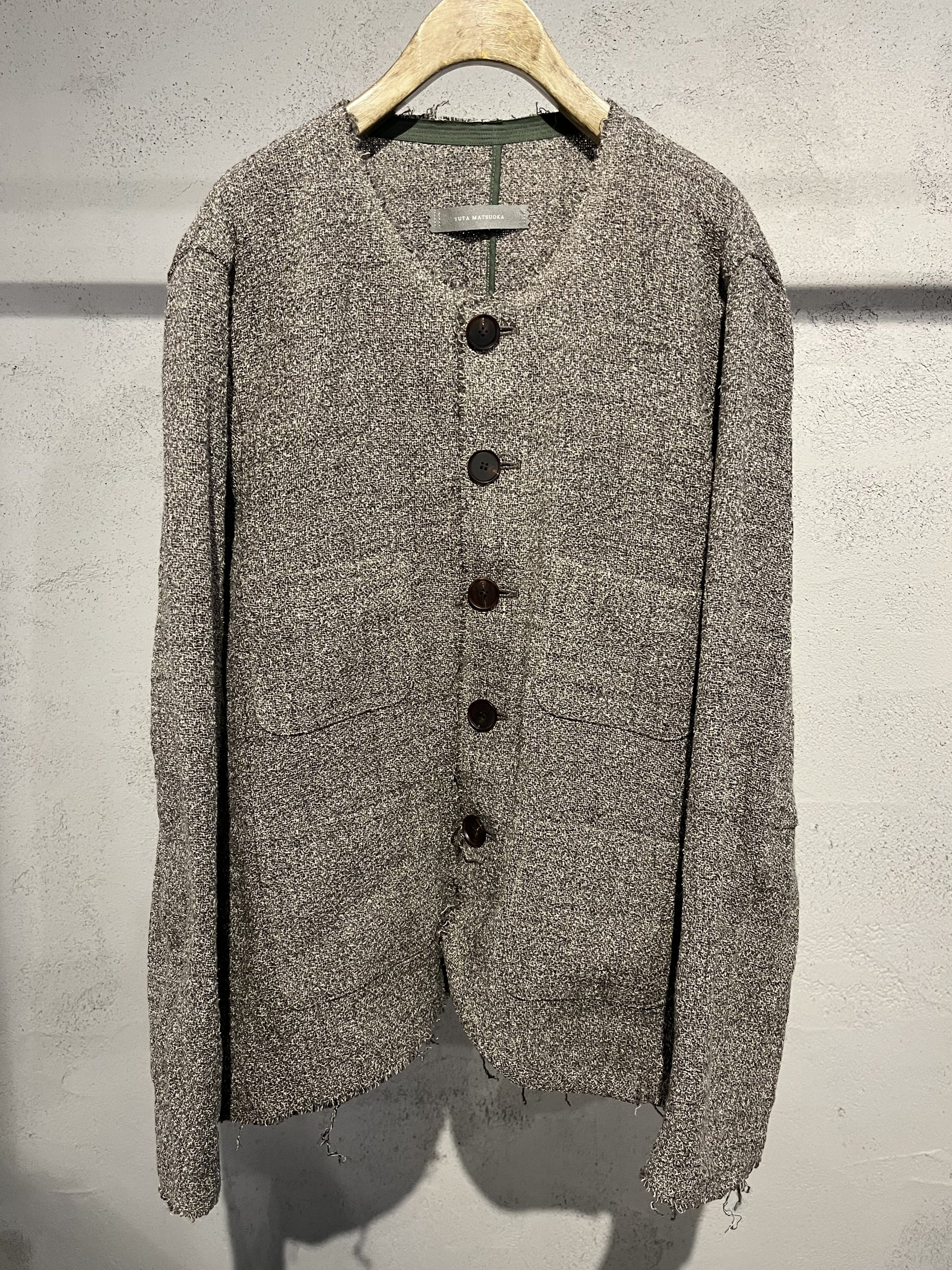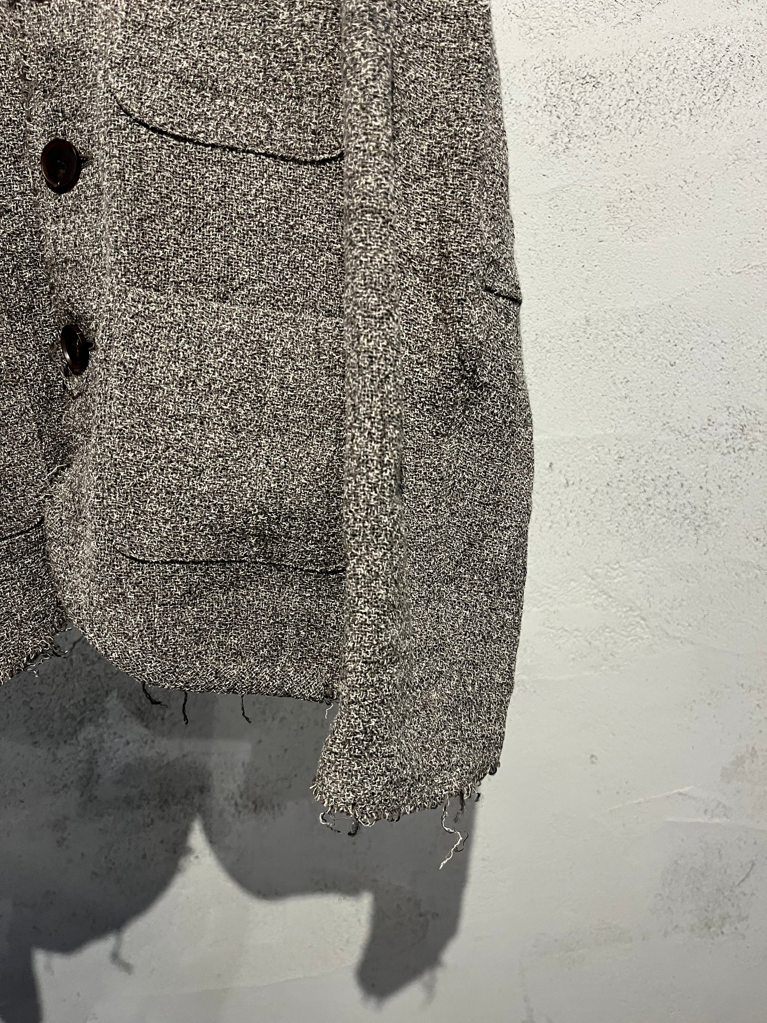 ポケットの配置や丈感はそのままに、襟や裾は断ち切りでシャネルにはない粗野な印象に仕立てた。